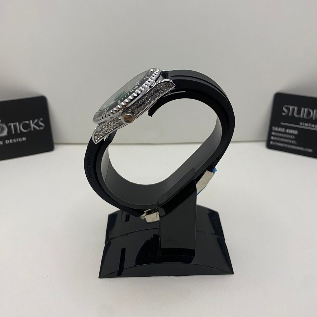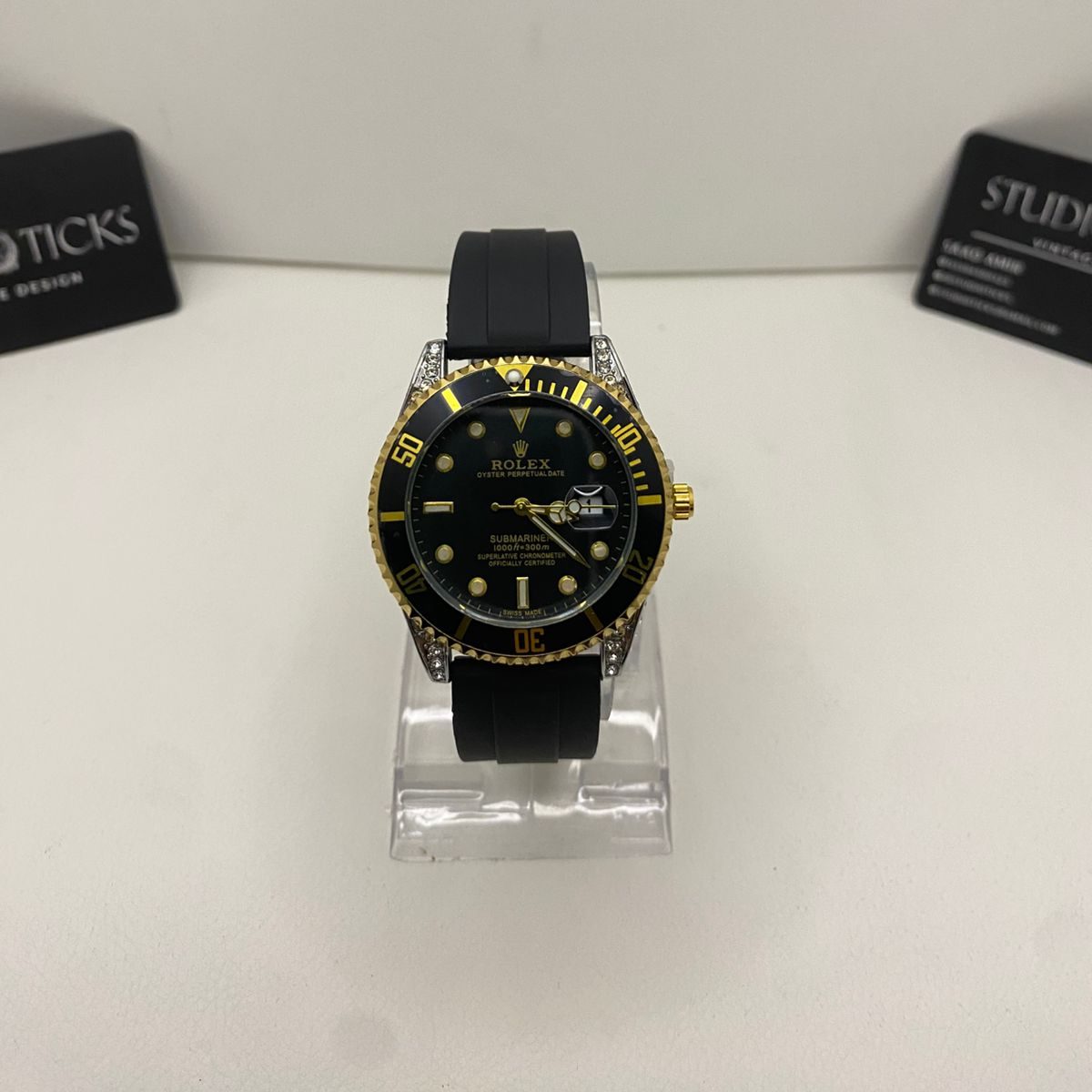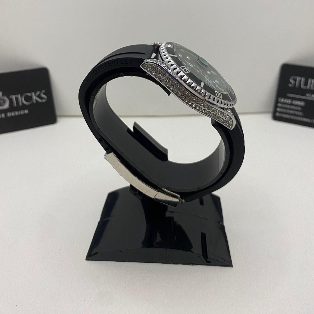 A bold take on the classic Submariner, available in Black-Silver and Black-Gold variants. Designed with a durable rubber strap, diamond-accented lugs, and a rotating bezel for a sporty luxury appeal.